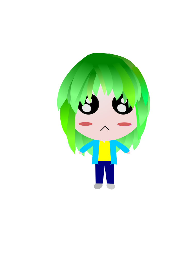 This features a cartoon character with green hair, wearing a blue jacket and jeans. The character appears to be standing in front of a wall or a plain background. The character's facial expression is somewhat sad or displeased, giving the impression that it might not be enjoying its time. The overall scene has a simple yet charming appearance, with the cartoon character being the main focus of the image.