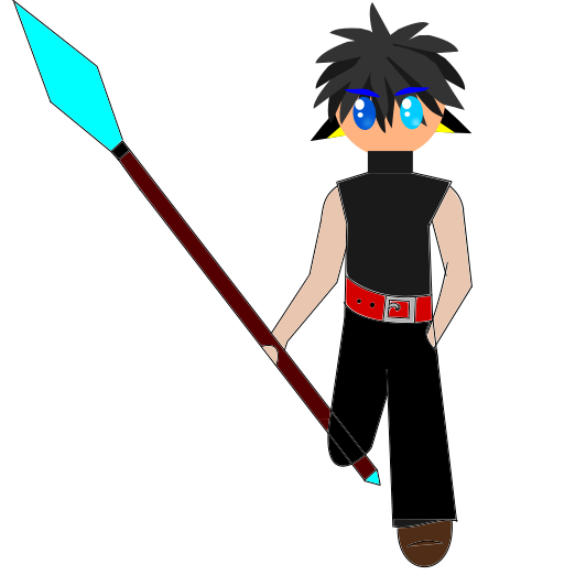 This features a cartoon character with a blue and red sword, standing in front of a white background. The character is wearing a black shirt and has a red belt around their waist. They are holding the sword in one hand while the other hand rests on their hip. The overall appearance gives off a sense of strength and determination.