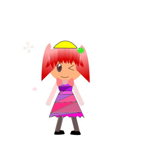 This features a cartoon character, specifically a girl with red hair and a yellow hat. She is wearing a colorful dress that has pink, blue, and purple stripes. The girl appears to be posing for the camera, possibly in a playful manner. Her outfit gives her an animated and lively appearance.