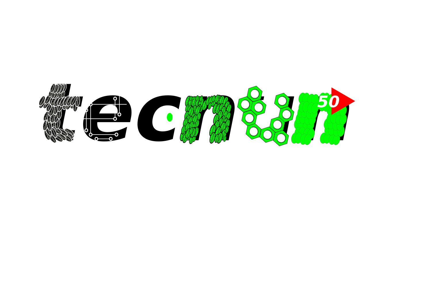This features a white background with the word "Tecnun" written in black. The letters are arranged in such a way that they resemble a logo for a university campus. The design incorporates various elements, including feathers, leaves, and bio nuts, which add visual interest to the overall appearance of the text. The combination of these components creates an eye-catching and unique logo that could be used for promotional purposes or as a symbol of pride for the university.