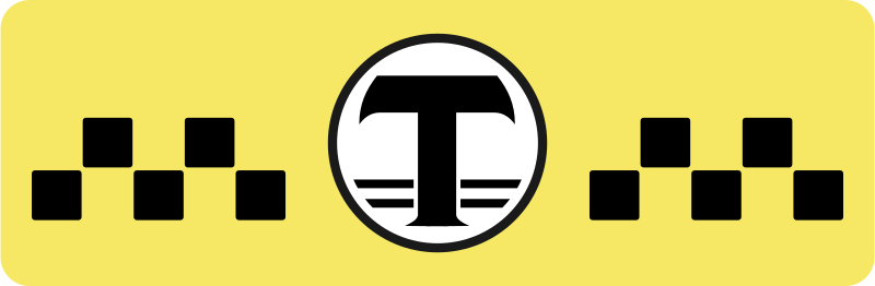 This features a yellow background with a logo that resembles a taxi. In the center of the logo, there is an emblem that includes a circle and a letter T. This design gives off a vintage or retro feel to it. The color scheme of the logo consists of black, white, and yellow, which adds to its distinctive appearance.