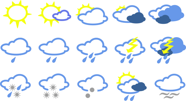 This features a collection of weather icons, each representing different types of weather conditions. There are nine distinct cloudy icons, with varying shapes and sizes, showcasing the different appearances of clouds in various weather situations. Additionally, there are six sunny icons, which represent clear skies and warm temperatures. These icons come in different styles as well, adding variety to the collection. The combination of these weather icons creates a visually appealing representation of the diverse weather conditions that can be experienced throughout the year.