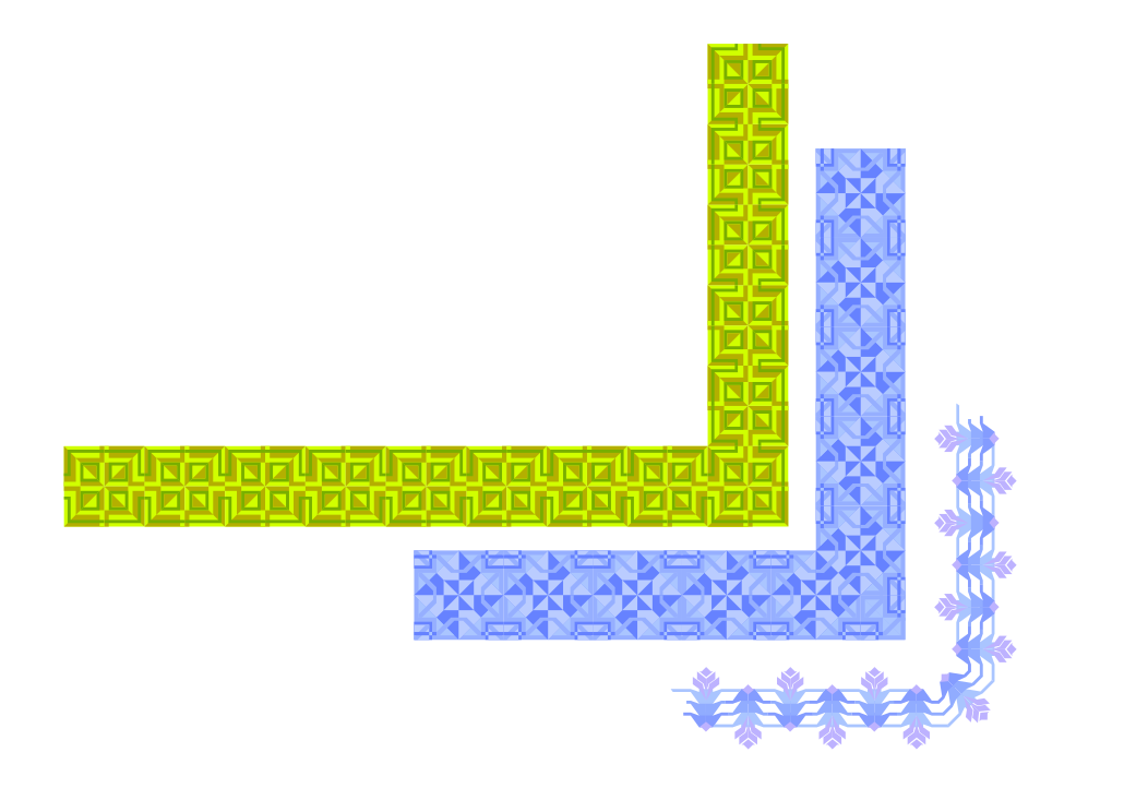 This features a blue and yellow tile design with a unique pattern. The tiles are arranged in an intricate, interconnected manner that creates a visually appealing and complex structure. The blue and yellow colors create a vibrant contrast against each other, making the overall design stand out. This artistic arrangement of tiles could be used as a decorative element or even as part of a larger mosaic project.