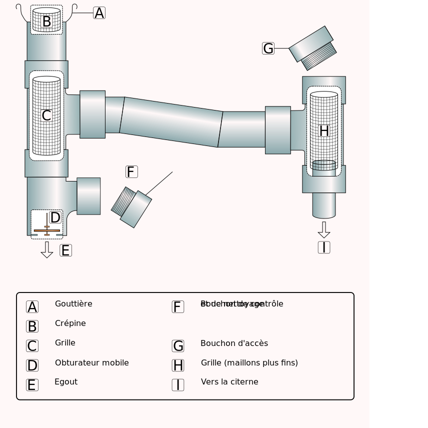 This displays a diagram of a system for storing rainwater. It shows the different components involved in this process, including a gutter, strainer, grid, mobile lock, sewer, control and cleaning plug, access plug, water tank, and an empty cell. Each component is labeled with its corresponding letter or number, making it easy to understand the system's layout and function. The diagram provides a clear visual representation of how rainwater can be collected, stored, and managed effectively for various purposes such as irrigation, drinking, or even flushing toilets.