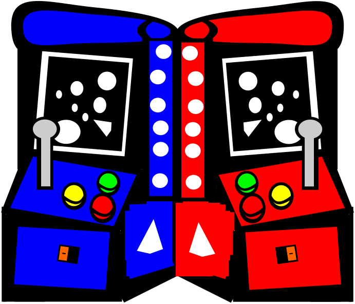 This features a colorful illustration of an arcade game machine, with two doors open to reveal the inside. Inside the machine are various buttons and controls, including multiple joysticks on both sides. There is also a keyboard visible within the machine. The buttons and controls are arranged in different positions, creating a visually engaging scene that showcases the inner workings of an arcade game.