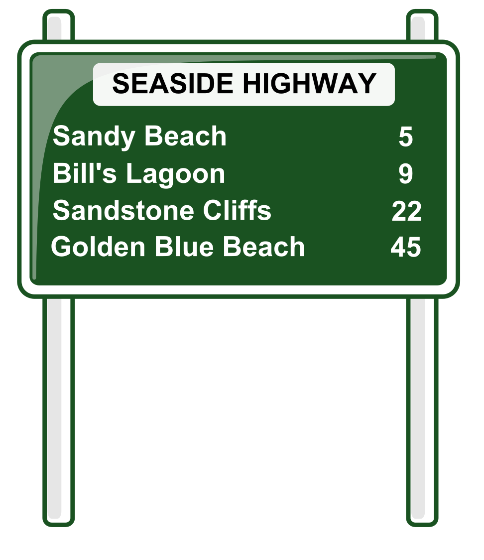 This features a green sign with white text that reads "Seaside Highway." Below the main heading, there are several destinations listed on the sign. These include "Sandy Beach," "Bill's Lagoon," "Sandstone Cliffs," and "Golden Blue Beach." Each destination is accompanied by a number, indicating their distance from the highway. The sign appears to be pointing towards these various locations, providing guidance for travelers on their journey.
