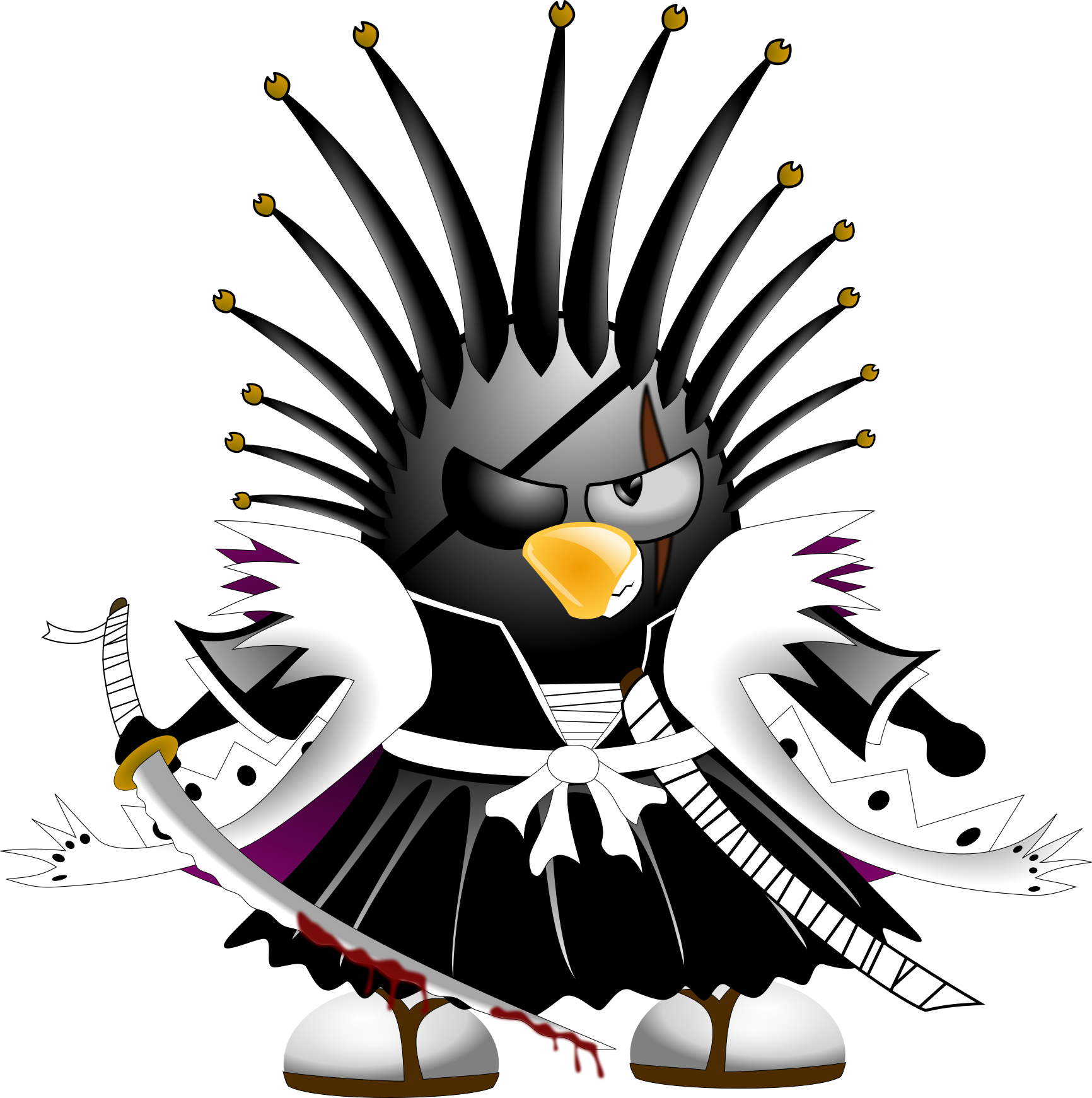This features a cartoon penguin with spiky hair, dressed in black and white clothing. It has a black eye patch over one of its eyes, giving it an angry appearance. The penguin is holding two swords, one on each side, adding to the fierce look of the character. The overall design of the penguin gives it a unique and interesting look that stands out in the image.