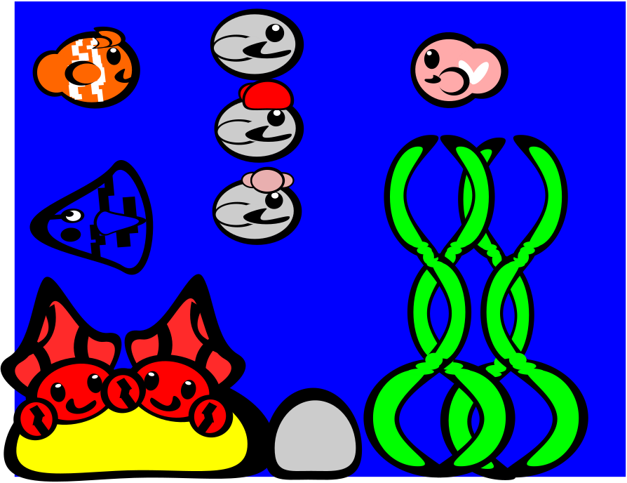 This features a collection of various cartoon characters and objects, all set against a blue background. Among the items are several different types of fish, including one that is yellow with red eyes, another that has a pink body, and a third that appears to be a dragon or a similar creature. There are also two balls in the scene, one located near the center and the other towards the right side. Additionally, there are three bowls placed around the image, with one on the left side, one in the middle, and another on the far right. The overall composition of the image creates an interesting and colorful display of cartoon characters and objects.