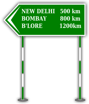 This features a green sign with white text, indicating the distance to various locations. The sign is placed on top of two green poles, which are positioned in front of a blank background. The sign displays information about distances to New Delhi and Mumbai (Bombay), as well as other cities like Kolkata and Chennai. The text on the sign reads "New Delhi 500 km, Mumbai (Bombay) 800 km, Kolkata 1200 km, Chennai 600 km." This sign is likely used to provide guidance or information for travelers and commuters.