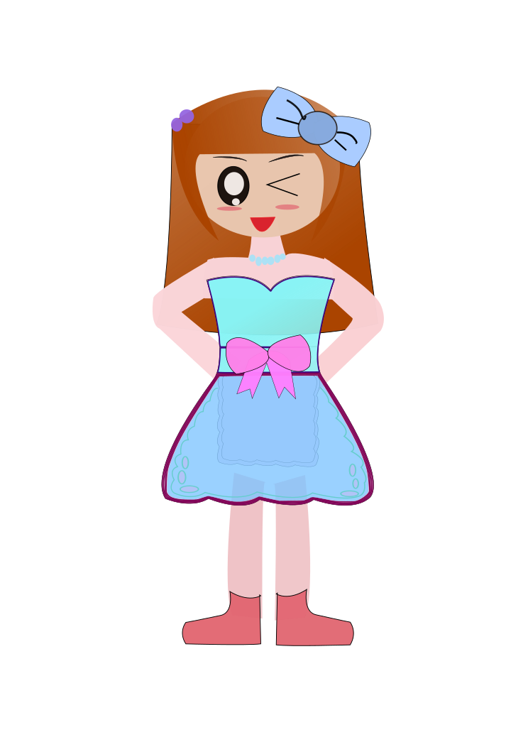 This features a cartoon girl wearing a blue dress with pink bows. She is standing in the center of the frame, posing for the camera. Her outfit includes a bow in her hair and she has a playful expression on her face. The overall scene appears to be a fun and lighthearted illustration.