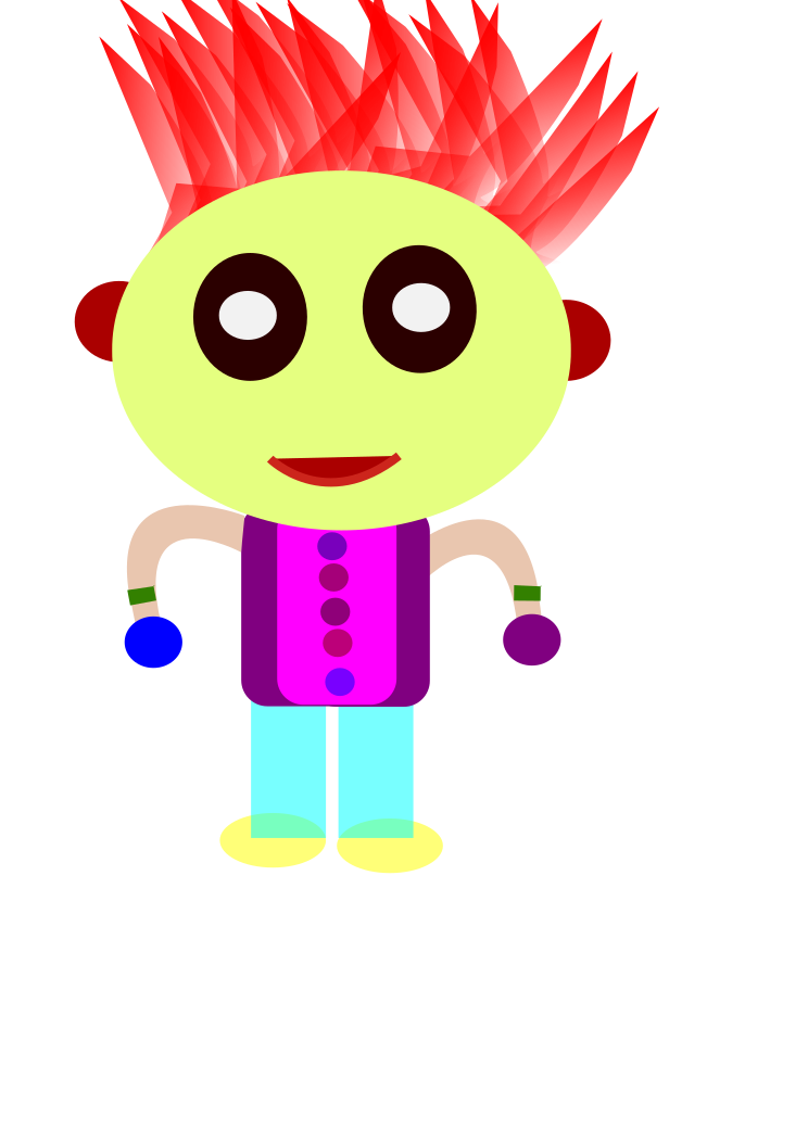 This features a cartoon character with red hair and a pink vest. This character is standing in front of a white background, giving it a clean and simple appearance. The character appears to be wearing blue shoes, which adds an interesting detail to the overall design. The combination of the red hair, pink vest, and blue shoes creates a unique and eye-catching visual that stands out from typical cartoon characters.