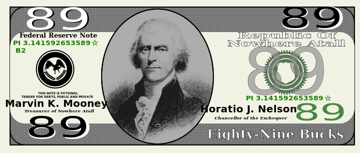 This features a United States of America bill with the number 89 on it. The bill is in the form of a Federal Reserve Note and has a picture of George Washington, the first President of the United States, on it. The bill also displays the phrase "In God We Trust" at the top. The bill is described as being from the year 1989, which indicates that it was printed during that time period.