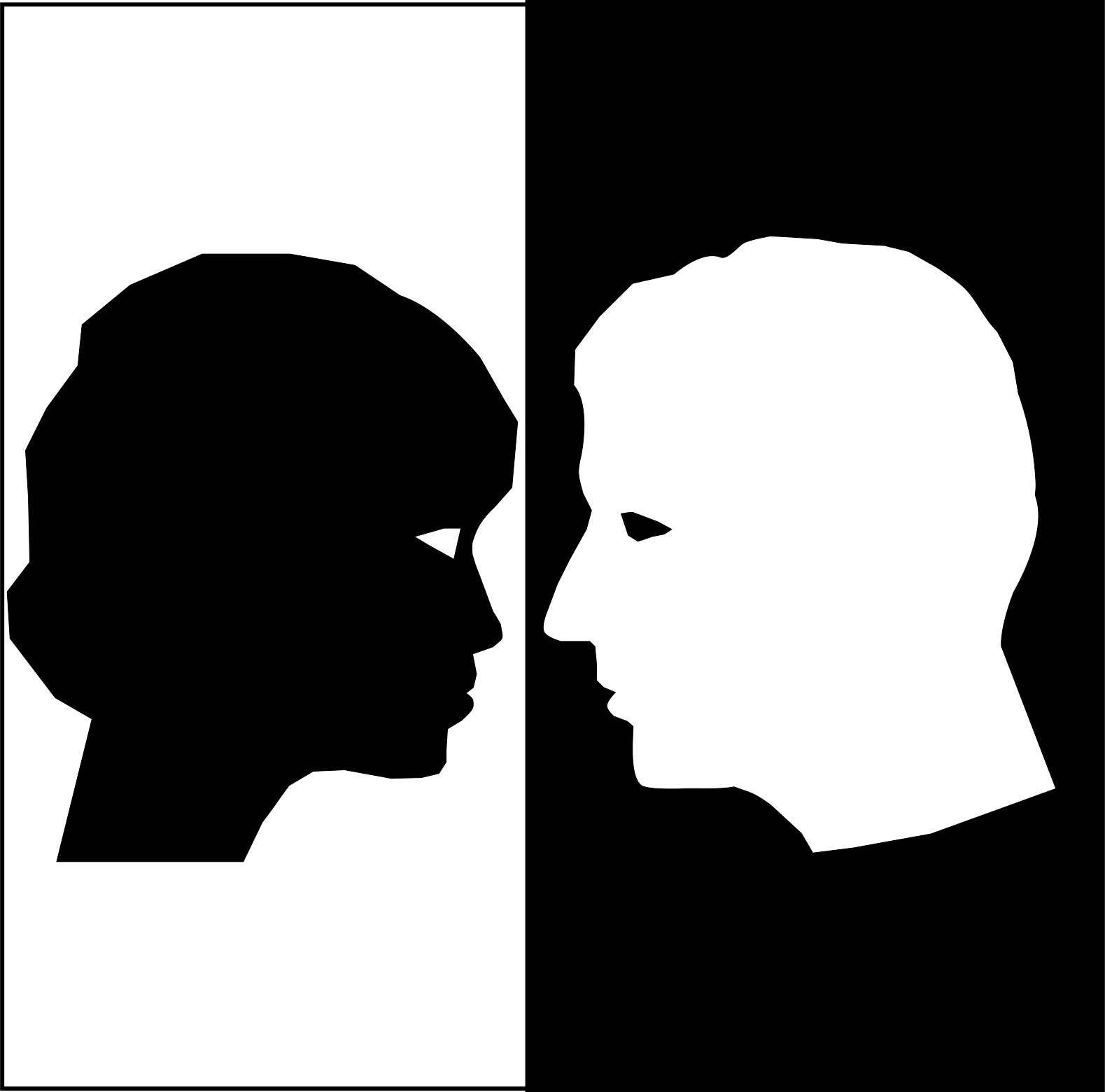 This features a black and white photo of two people, one on the left side and another on the right. They appear to be engaged in conversation or looking at each other closely. Both individuals are wearing ties, which adds an element of formality to their interaction. The contrast between the black and white photo and the subjects' attire creates a visually striking scene that captures the essence of human connection.