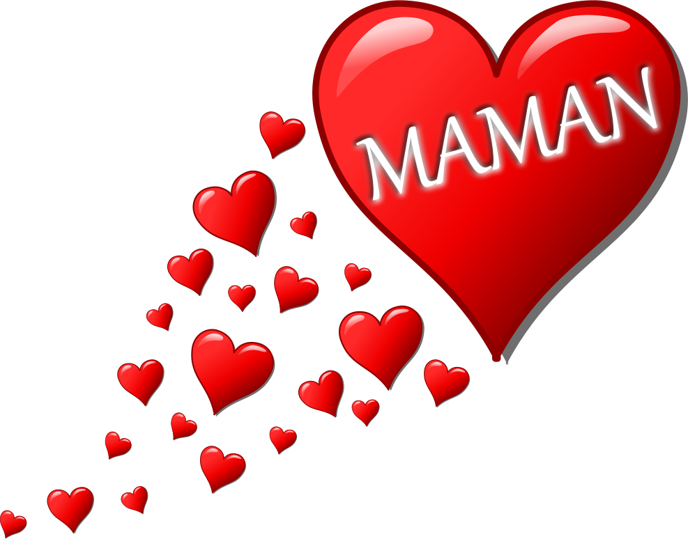 This features a heart with the word "Maman" written on it, surrounded by numerous small hearts. These hearts are scattered throughout the scene in various positions and sizes, creating an overall warm and loving atmosphere. The main heart is red, while the smaller hearts come in different shades of pink, adding to the visual appeal of the image. This design could be used for a Mother's Day card or as a decoration to celebrate the special occasion.