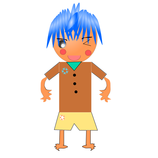 This features a cartoon character with blue hair and an orange shirt. This character is standing in the center of the frame, posing for the camera. The character appears to be wearing shorts, which are yellow in color. The overall appearance of this character gives off a fun and playful vibe.
