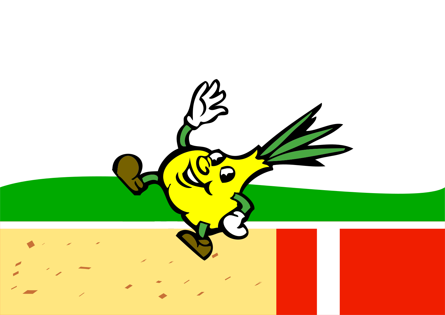 This features a cartoon character, resembling a yellow squash or pumpkin, in mid-air. It appears to be an animated drawing of a person wearing a pair of shoes and socks while jumping. The character is the main focus of the scene, with its legs spread wide apart as it leaps into the air. The background consists of a red and white tennis court, which adds a contrasting color scheme to the overall image.