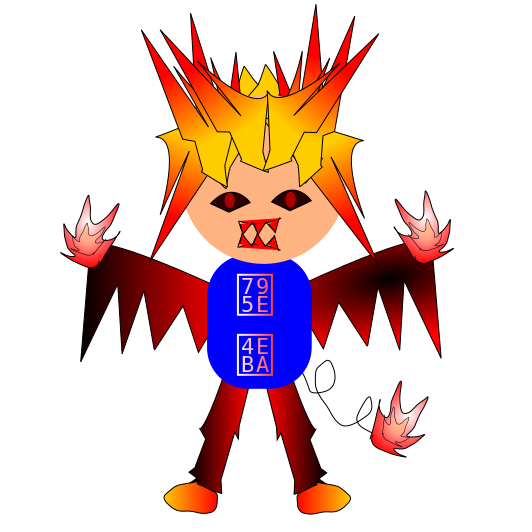 This features a cartoon character with an angry expression, wearing a blue shirt that says "64BA". This character is depicted as a fireman or demon-like creature, with flames surrounding it. The character's face has a menacing look and its mouth appears to be open in a snarling manner. The cartoon figure stands out against the background, making it the focal point of the image.