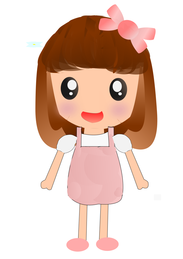 This features a cartoon girl with brown hair, wearing a pink dress and a bow in her hair. She is standing up straight and appears to be smiling at the camera. Her outfit includes a white apron that adds a touch of whimsy to the scene. The overall appearance of the character suggests a cheerful and friendly demeanor.