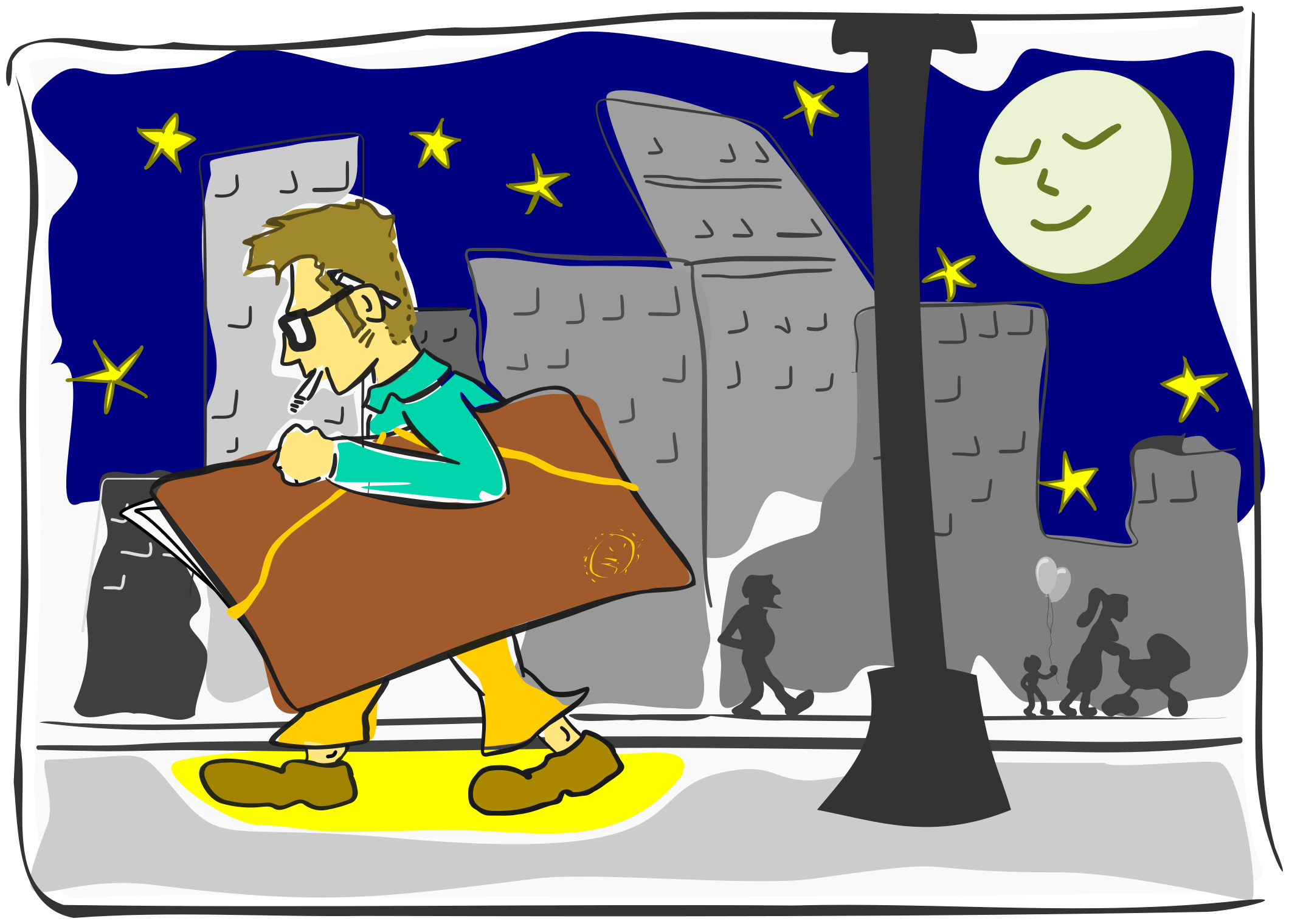 This depicts a man walking down the street at night, carrying a large book under his arm. He is wearing glasses and appears to be focused on his task. There are several other people in the scene, some of whom are also carrying books or backpacks. A clock can be seen hanging from a pole near the center of the image. The overall atmosphere suggests that this could be an illustration for a blog article about a cartoonist or comic artist.