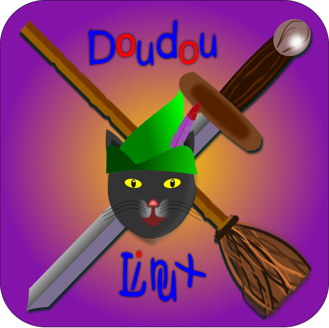 This features a cat wearing a green hat and holding a broom. The cat is positioned in the center of the scene, with its head turned to the side. In addition to the cat, there are two swords on either side of it, one on the left and another on the right. Above the cat, there is a word that reads "doudou" written in blue letters. The overall composition creates an interesting and playful scene with the cat as the focal point.