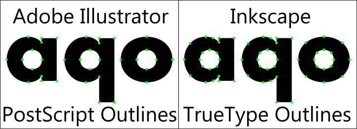 This displays a comparison between two different types of outlines, one being PostScript and the other TrueType. The PostScript outline is created using Adobe Illustrator, while the TrueType outline is created with Inkscape. To further enhance the appearance of the TrueType outline, dots are added to it. This image showcases the differences between these two types of outlines and how they can be used in various design projects.