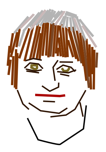This is a colorful drawing of an older woman with short brown hair. She has a distinctive look on her face, possibly due to the way she's drawn or the colors used in the artwork. The woman appears to be wearing lipstick and has a slightly frowning expression. The drawing itself seems to have been created using a combination of different colors, giving it an interesting visual effect. Overall, the image captures a unique and intriguing portrait of an older woman with a distinctive appearance.