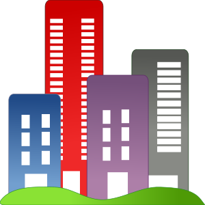 This features a unique illustration of four city buildings, each with different colors and sizes. These buildings are arranged in a way that they appear to be stacked on top of one another, creating an interesting visual effect. The buildings are blue, red, purple, and gray, adding variety to the scene. In addition to the buildings, there are two small green hills located in front of them, providing a touch of nature to the urban landscape. This creative illustration captures the essence of city life while also incorporating elements of natural beauty.