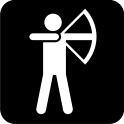 This features a black and white drawing of a man holding a bow, with an arrow in his hand. He appears to be focused on the target he is aiming at. The drawing is likely used as a symbol or representation for a specific activity or sport, such as archery. The simplicity of the drawing highlights the main subject matter, which is the man and his bow.