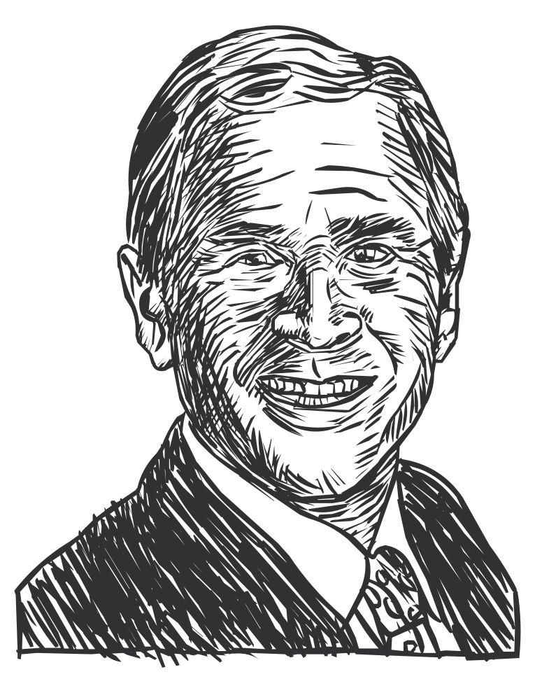 This is a black and white drawing of George W. Bush, the 43rd President of the United States. He has a smiling expression on his face as he poses for the portrait. The drawing captures the essence of the man's features, including his eyes, nose, mouth, and ears. The image is reminiscent of an old photograph or a vintage illustration, giving it a classic feel.