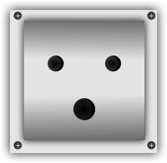 This features a close-up of an electrical outlet with three black dots on it. These dots are arranged in a way that gives the appearance of eyes, making the outlet look like a smiley face. The outlet is made of metal and has a silver color to it. It appears to be a functional piece of equipment for connecting various electrical devices.