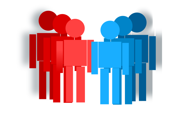 This features a group of six people standing next to each other, with three on the left side and three on the right. Each person is represented by a small figure made up of red or blue squares. These figures are arranged in such a way that they appear to be interacting with one another, creating an interesting visual effect. The combination of colors and shapes gives the image a unique and engaging appearance.