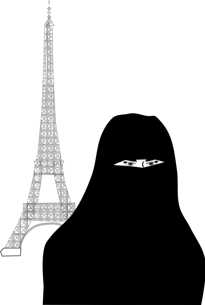 This features a silhouette of the Eiffel Tower, with a woman wearing a burka or niqab standing in front of it. She is positioned to the left side of the tower and appears to be looking at something beyond the frame. The black and white color scheme adds an artistic touch to the scene, emphasizing the contrast between the woman's attire and the iconic landmark.
