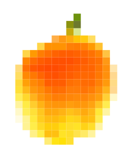 This is a pixelated representation of an orange, which appears to be a peach. It has been digitally altered and is now displayed in a square format with various shades of yellow and orange. The overall effect gives the impression that it's a digital art piece rather than a real photograph.