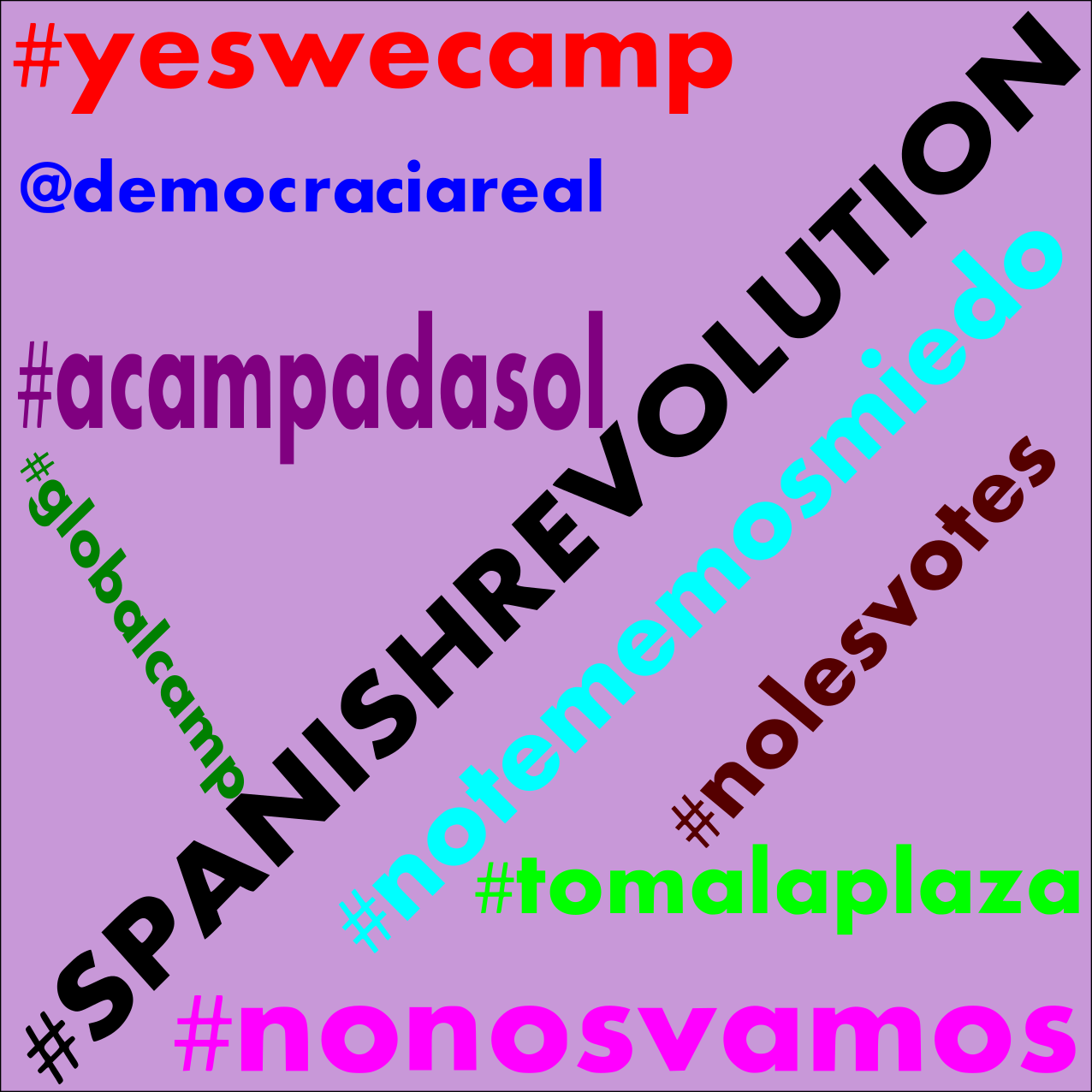 This is a collage of various tweets and hashtags, all related to the Spanish language. There are multiple instances of the word "we" in different colors and sizes, indicating that it might be an advertisement or promotional material for something. The tweets are arranged in a visually appealing manner, with some words overlapping each other. The collage includes various hashtags such as #yescamp, #democraciareal, and #revolucion. These hashtags suggest that the image is related to political or social movements. The tweets are spread across different areas of the collage, with some words appearing larger than others, creating a sense of depth in the composition. Overall, the image conveys a message about the Spanish language and its importance in today's world.