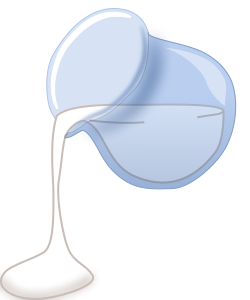 This features a light blue glass pitcher, which is pouring milk onto the surface. The pitcher appears to be made of clear glass and has a slightly curved shape. It seems to be in the process of being poured into a cup or another container. The scene captures the action of the milk flowing from the pitcher, creating an interesting visual effect.