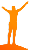 This features a silhouette of a man standing on top of a hill, with his arms raised in the air. He appears to be celebrating or triumphantly raising his hands up high. The scene is set against an orange background that adds a vibrant touch to the overall composition. The man's figure stands out prominently against the backdrop, creating a sense of depth and dimension within the image.