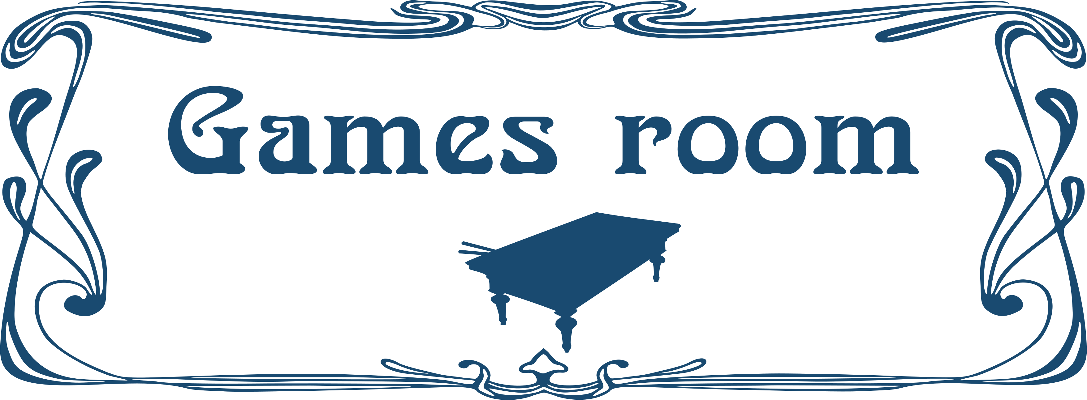 This features a sign for a games room or rec room, with an art nouveau style design. The sign is blue and white in color, and it has a billiard table silhouette as part of the decoration. This unique design element adds to the overall aesthetic appeal of the sign. The sign appears to be placed on a wall, likely drawing attention to the games room or rec room's offerings for visitors or members.