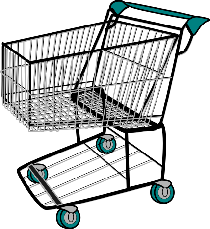 This features a black and white cartoon drawing of an empty shopping cart. The cart is prominently displayed in the foreground, with its handle extended outwards. The cart has four wheels visible, two on each side, providing stability as it sits upright. This creative representation of a grocery cart adds a touch of humor and artistic flair to an otherwise mundane object.