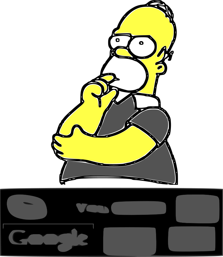 This features a cartoon drawing of the character Homer Simpson, who is known for his distinctive yellow skin tone and bald head. He appears to be wearing a black shirt with white trim, giving him a more formal look. In this particular scene, he seems to be deep in thought or contemplating something, as he has his hand under his chin. The drawing itself is quite detailed, capturing the essence of Homer Simpson's appearance and personality.