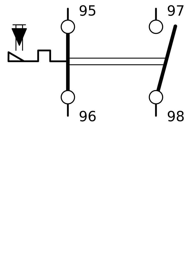 This is a diagram of an electrical system, possibly related to train tracks. It features several numbers and symbols, indicating various aspects of the system. There are two main diagrams in the picture, one on top of the other, with the upper one being larger than the lower one. The upper diagram has a number 98 at its center, surrounded by smaller numbers and symbols. The lower diagram is more complex, containing multiple lines and numbers that seem to represent different parts of the electrical system. There are also two arrows in the image, pointing towards the top right corner and the bottom left corner respectively. These arrows might indicate directions or connections between different elements within the electrical system.