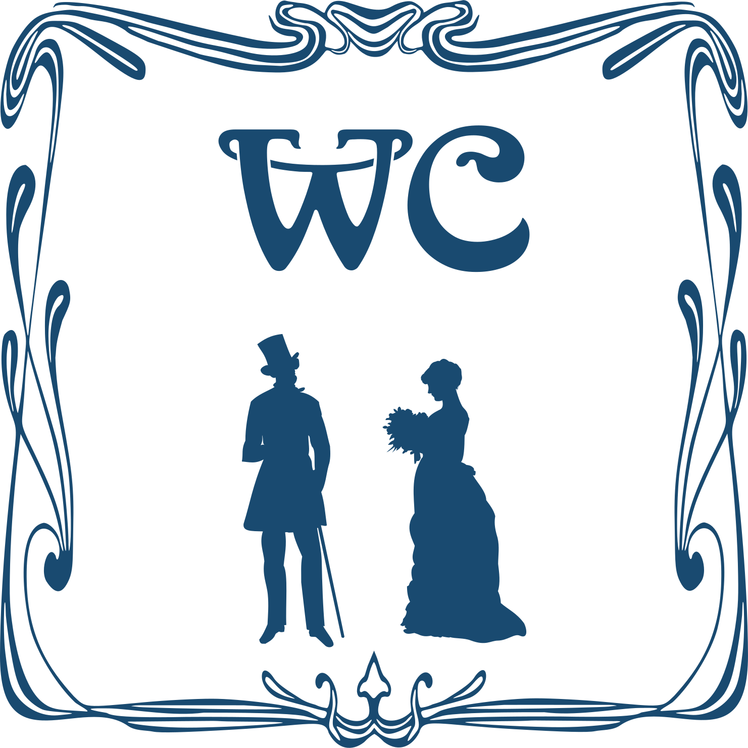 This features a man and woman standing next to each other, with the woman wearing a dress. They are positioned in front of an ornate frame that reads "WC." This sign is likely meant for a restroom or bathroom facility. The silhouettes of the couple create a sense of depth and contrast against the blue background of the image.