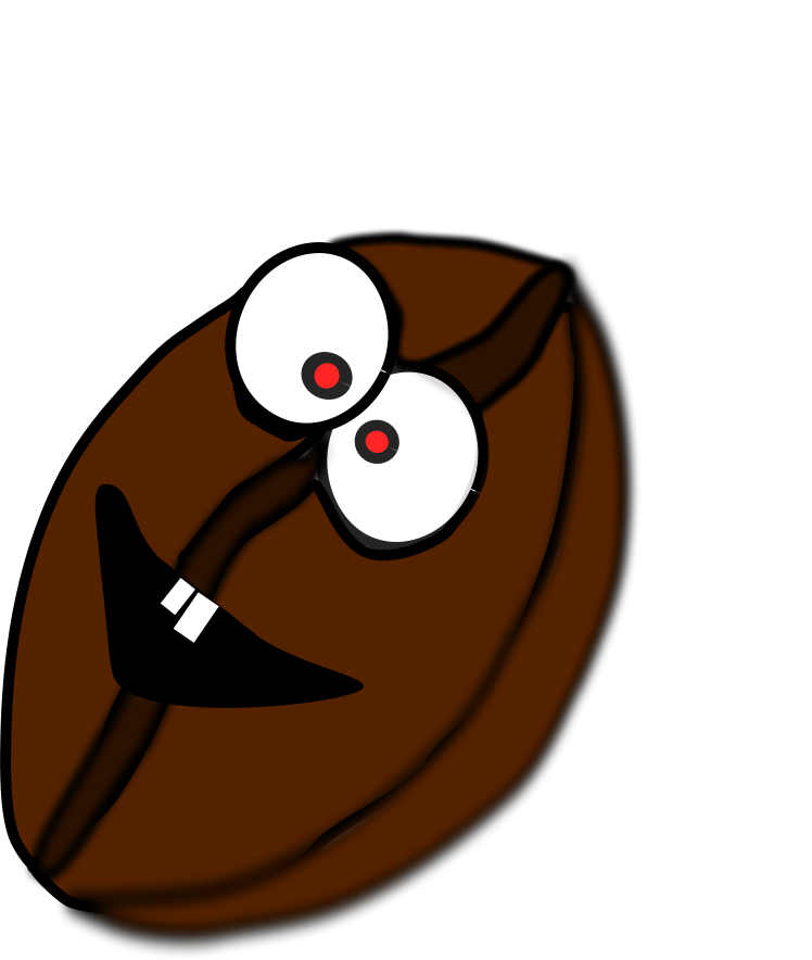 This features a cartoon-like drawing of a coffee bean with a face. It has two eyes, one on the left side and another on the right side, as well as a mouth in the center. The bean is smiling, giving it a friendly appearance. The drawing is colorful, adding to its playful nature. This creative representation of a coffee bean could be used for various purposes such as advertising or decoration.