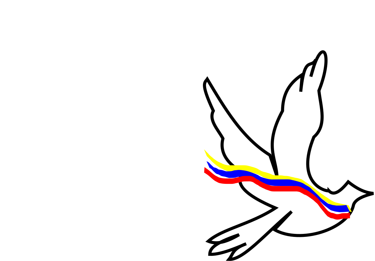 This features a white dove with red, yellow and blue colors flying in the sky. It appears to be a drawing or painting of the bird against a backdrop of a plain color. The dove's wings are spread out as it soars through the air, giving an impression of freedom and grace. The vibrant colors on the dove contrast with the plain background, making it stand out prominently in the scene.
