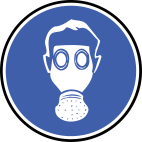 This features a blue circle with a white outline, which is an icon of a gas mask. Inside the circle, there is a man's face wearing a gas mask, giving the impression that he is looking at something or someone. The gas mask appears to be a prominent symbol in this context, possibly representing safety or protection from harmful substances.