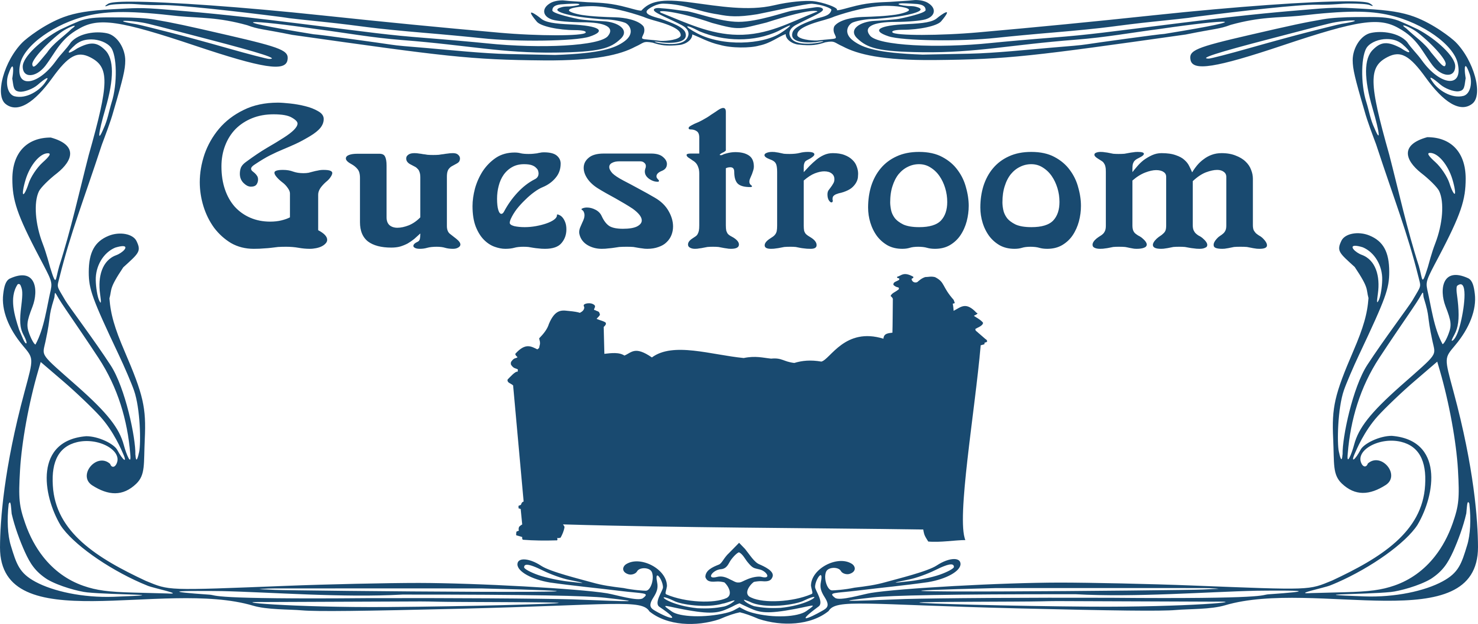 This features a sign for a guest room, which is designed in an art nouveau style. The sign has a silhouette of a comfortable antique bed as its central focus, making it the perfect decoration for any guest room. The design of the sign is elegant and sophisticated, with intricate details that add to its charm. Overall, this sign exudes warmth and hospitality, inviting guests to relax in the comfort of their own private space.