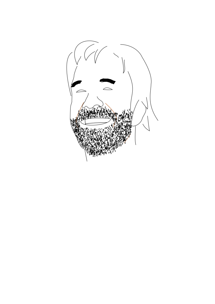 This is a drawing of a man with a beard and mustache, wearing glasses. He has a large smile on his face, giving the impression that he's happy or enjoying himself. The drawing appears to be done in black and white, which adds an artistic touch to the overall appearance. The man is the main focus of the image, occupying most of the frame as he stares directly at the viewer.