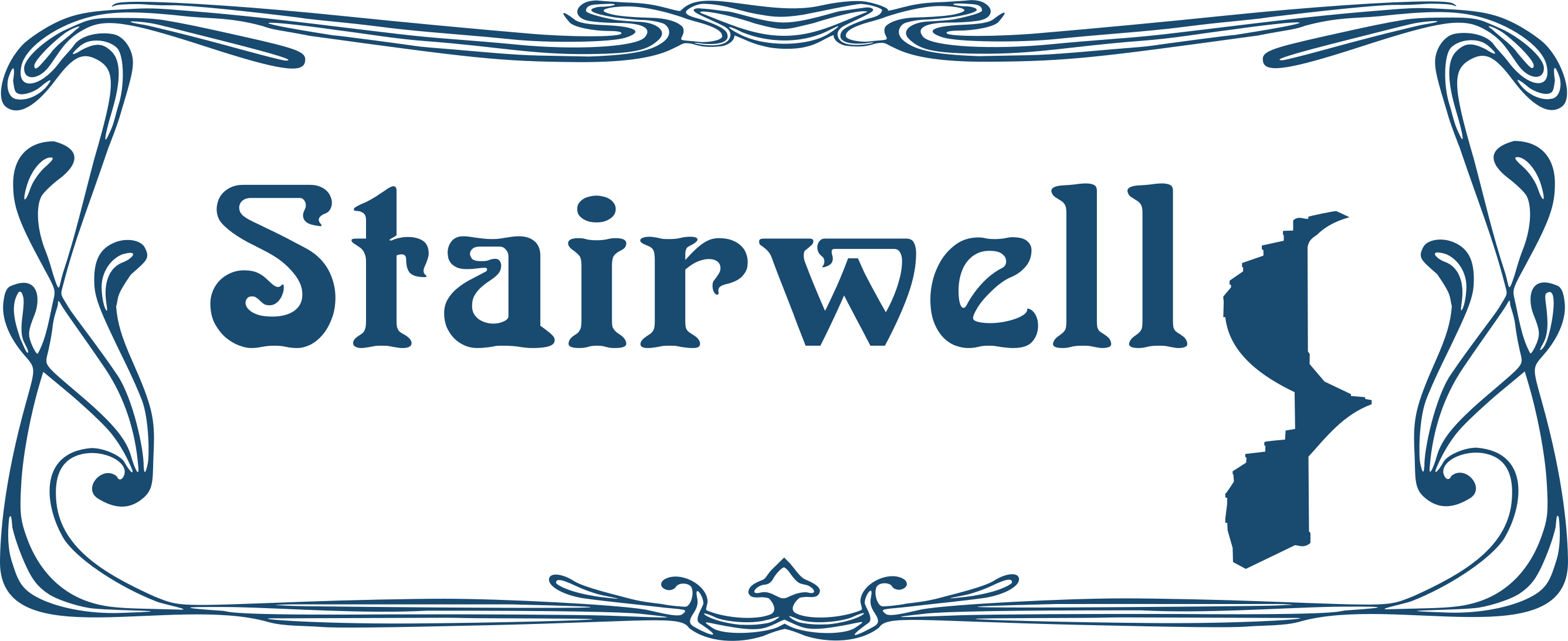 This features a sign that reads "Stairwell" in an art nouveau style. The sign is decorated with a silhouette of a spiral staircase, which adds to its visual appeal. The design of the sign suggests it could be used as a decorative piece or to mark the entrance to a stairwell. The combination of text and artistic elements creates an attractive and unique appearance for this particular sign.