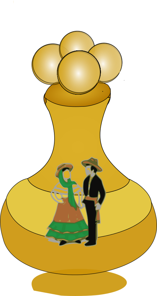 This features a vase with two people standing inside of it. One person is positioned on the left side, and the other is on the right side. They appear to be a man and woman dressed in Mexican attire, possibly a mariachi band member and his partner. The vase itself has an ornate design, giving it a fancy appearance. In addition to the two people inside the vase, there are three more figures visible outside of it, one on each side and another at the top. These figures may represent other elements or decorations associated with the vase's theme.
