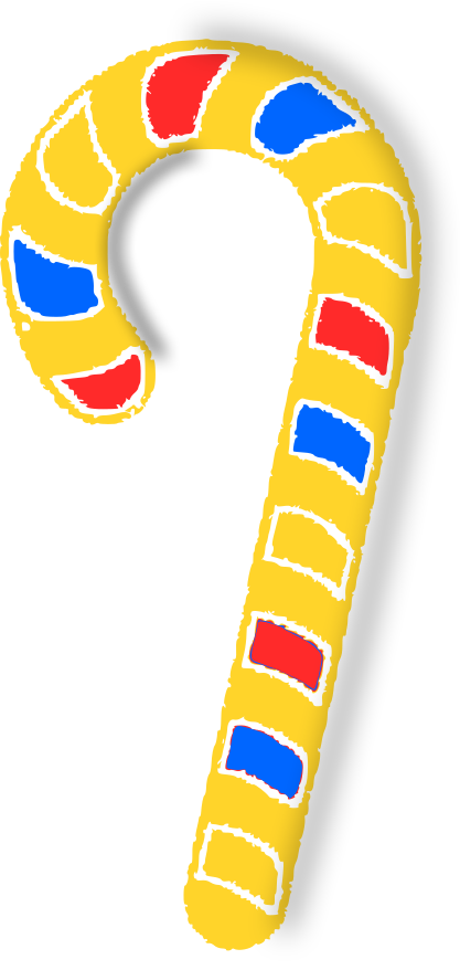 This features a candy cane with a yellow body and red, blue, and yellow stripes. It is placed against a white background, making the colors of the candy cane stand out even more. The candy cane appears to be made from paper or some other lightweight material, giving it a unique and playful appearance.