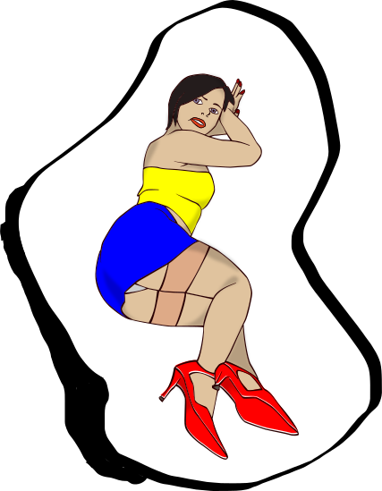 This features a woman wearing a yellow dress and red shoes. She is sitting down with her legs crossed, giving the impression of being in a relaxed position. Her outfit includes stockings and high heels, adding to the overall style of the scene. The woman appears to be looking upwards, possibly at something or someone off-camera. The image has a black background that contrasts well with the vibrant colors of her clothing and shoes, making it an eye-catching piece of artwork.
